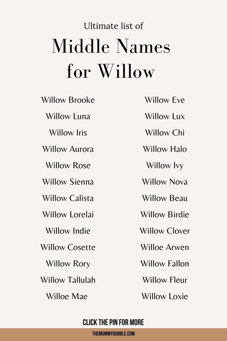 As you move closer to your due date, keep saying the names you have chosen in different tones of voice. Say them softly, say them loudly, and imagine calling them out at a playground or seeing them written on a graduation program. This helps you get a real feel for how the name will function in the world. Whatever you choose, the combination of a name like Willow with a special and rare middle name will ensure that your child has a moniker as special as they are. Enjoy this creative process and celebrate the fact that you are building a beautiful identity for the new member of your family.